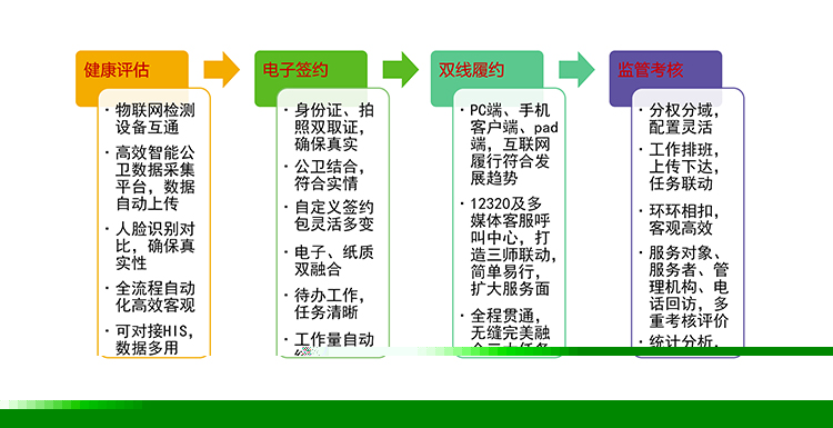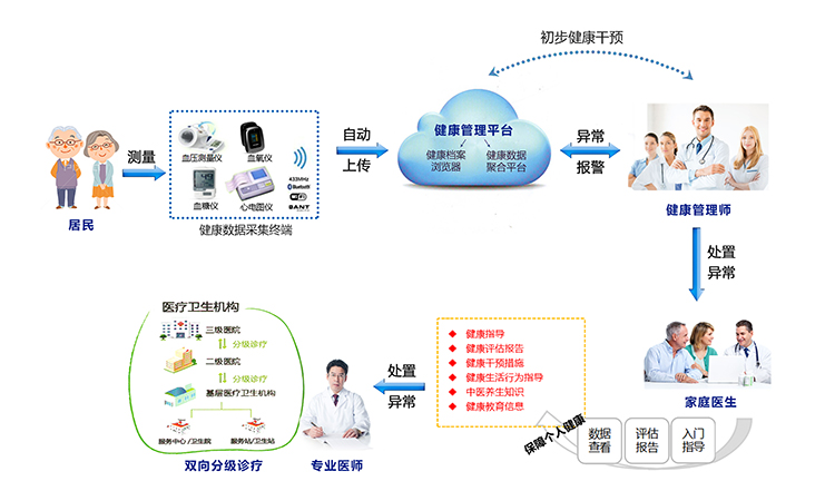 家庭醫(yī)生簽約平臺是實施家庭健康管理的服務平臺,它在社區(qū)范圍內,以家庭為單位,由社區(qū)衛(wèi)生服務中心和區(qū)域醫(yī)療衛(wèi)生協(xié)同服務體系提供支撐,建立居民健康檔案為分級診療制度建設逐步形成基層首診、雙向轉診、急慢分治、上下聯(lián)動的分級診療和就醫(yī)真正政 策落地模式,全方位的生命體征采集和檢測,線上線下的數(shù)據(jù)干預,為家庭成員提供綜合、連續(xù)、有效的基本衛(wèi)生服務。